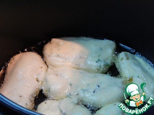 Включаем мультиварку в режим Поджаривание, наливаем масло. Брусочки рыбы обмакиваем в тесто и быстро выкладываем в разогретое масло. Жарим 5-7 минут до золотистого цвета.