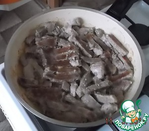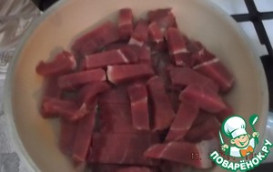 Сковороду разогреваем, кладем топленое масло и нарезанное на кусочки мясо.