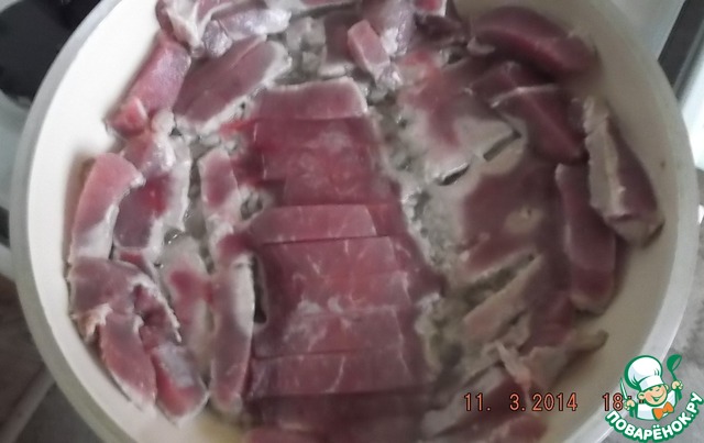 На сильном огне обжариваем мясо до корочки с одной стороны, а затем с другой.