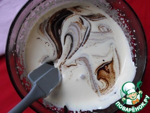 Вливаем к яичной массе растопленный шоколад, очень аккуратно перемешиваем до однородности.