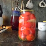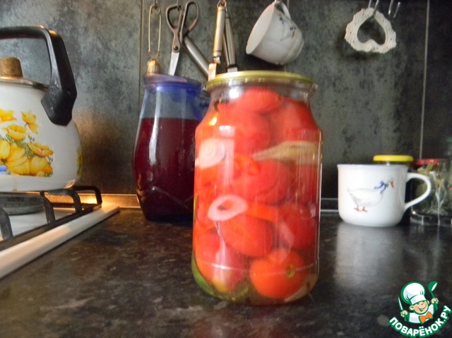 Вливаем кипящий маринад в банку с томатами, добавляем уксусную ЭССЕНЦИЮ, закатываем крышкой. После остывания храним в тёмном, прохладном месте.