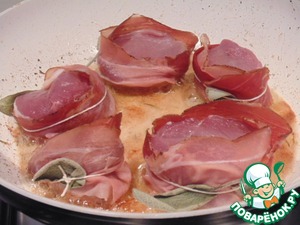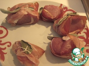 Обернуть филе беконом, на каждый кусочек положить 2 листочка шалфея, обвязать кулинарной нитью.