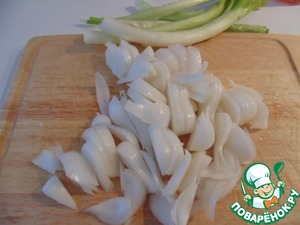 Лук помыть, зеленую часть отрезать, белую порезать дольками.