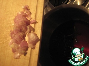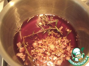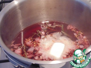 Готовим соус: лук-шалот порезать. В сотейник вылить красное вино, добавить лук,
