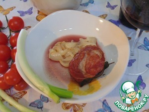 Нежное, сочное и ароматное мясо в беконе и шалфеем прекрасно сочетается с молодым луком. Мне показалось недостаточно и я приготовила еще красный винный соус, но когда попробовала мясо с луком, поняла, что и без него уже гармонично. Но с ним еще интересней. Поэтому решать вам, я напишу, как приготовила я.