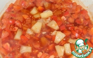 Добавить воду, положить нарезанный перец, консервированные ананасы и помидоры. Попробовать на вкус. Если соус слишком кислый, добавить остатки сахара. Тушить на медленном огне около 10 минут.