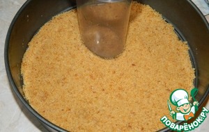 Сухари измельчить и смешать с мягким сливочным маслом. Полученную массу выложить в разъемную форму, утрамбовать, разровнять, например, стаканом.