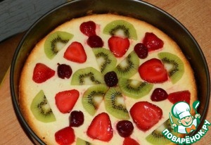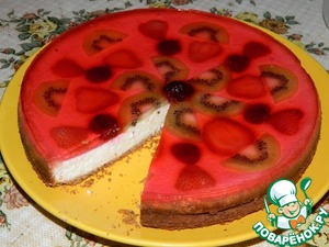Не снимая бока формы, аккуратно залить пирог горячим желе. Поставить в холодильник на 15 минут. Вкусный творожный пирог с фруктами готов!