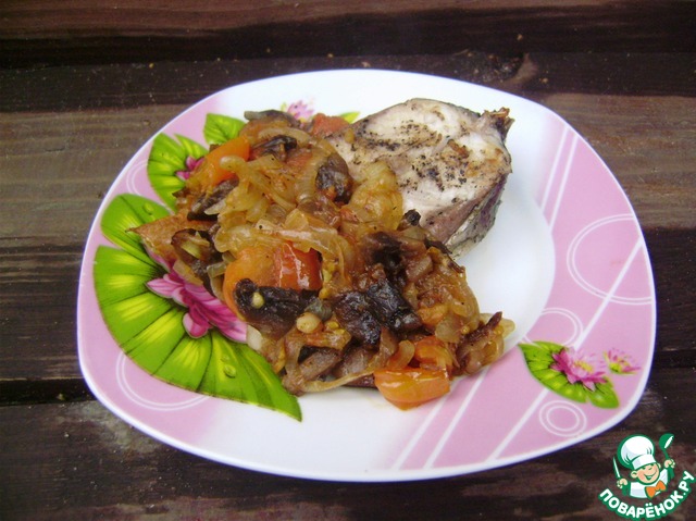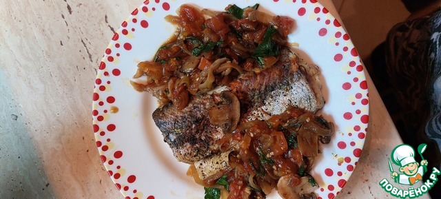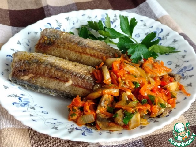 Рецепт «Хек под луково-грибным томатным соусом»: