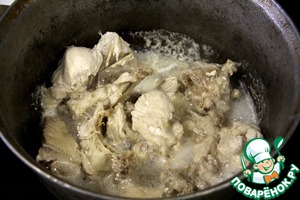 • Индюшку порубить на куски, помыть и слегка обжарить в казане.