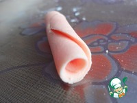 Берем один кружочек и сворачиваем его в трубочку. Последний край немного смачиваем водой и как бы приклеиваем его к трубочке.