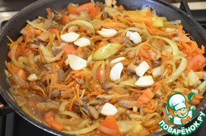 Выложить чеснок, разрезанный на дольки, и еще обжарить несколько минут.