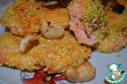 Рыбку нарезаем на куски, обсушиваем, немного солим и обваливаем в кукурузной крупе.