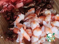 Для начинки мы нарежем очищенные креветки, вяленые томаты (без масла) и маринованный имбирь.