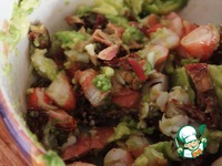Очистим авокадо и половину мякоти разомнем вилкой и соединим с нашей начинкой.