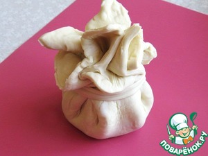 От теста отрезаем три полосочки по 1,5см. Остальное делим на три равные квадрата. На каждый квадрат кладём кусочек сыра и собираем тесто в "мешочек".