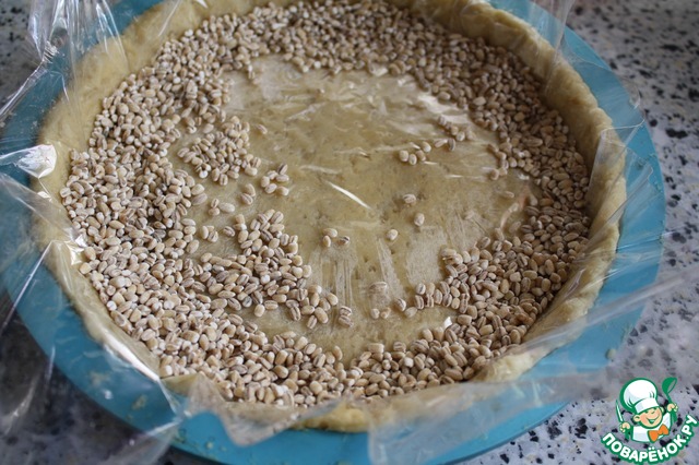 Тесто не убираем в холодильник, а сразу раскатываем распределяем по форме, накалываем вилкой и выстилаем поверх пакет для запекания- он лучше чем пекарская бумага, и насыпаем крупу.