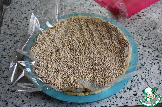 Заранее приготовить пакет для запекания и крупу (рис или перловку) Можно использовать сухую фасоль или горох, но т. к. они крупные, на поверхности готового коржа будут заметные вмятины.