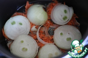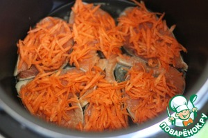 Морковь натереть на терке и выложить по чуть-чуть сверху на рыбу, морковь я тоже слегка подсаливала