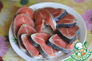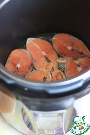 Налить в чашу растительное масло, выложить в мультиварку рыбу, у меня поместилось 6 кусочков. Посолить и поперчить рыбу.