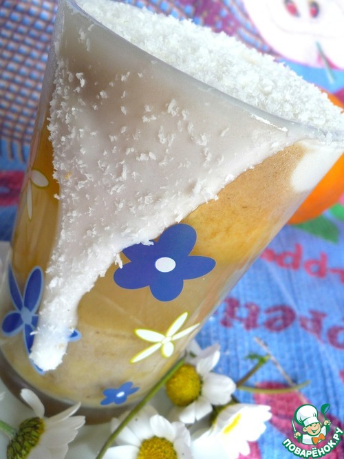 Поверх выкладываем слегка подтаявшее мороженое и посыпаем кокосовой стружкой.