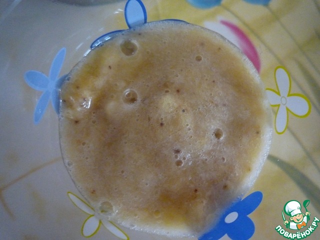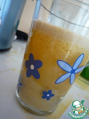 В мякоть банана мы добавляем сок из яблоки и айвы, далее осторожно вливаем апельсиновый сок. Если есть желание, то можно взболтать до однородной массы, а можно оставить слоями.
