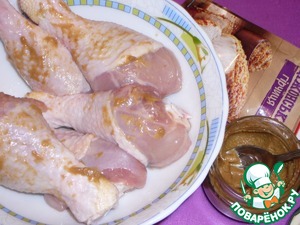 Натираем куриные голени смесью сахара (меда) и соли, горчицей (обычная или в зернах).