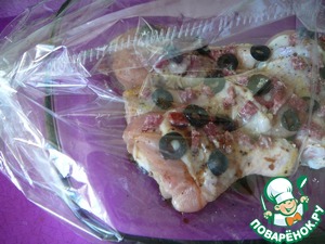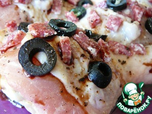 Закладываем чеснок и колбасу под кожицу, маслины и колбасу раскладываем поверху ножек.