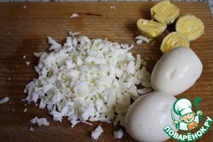• Яйца, сваренные «вкрутую», чистим, отделяем белок и желток. Белок мелко рубим, желток режем пополам.