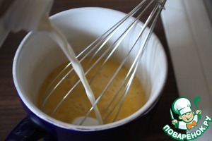 • Оставшееся сырое яйцо подбиваем венчиком, приправляем солью и перцем, доливаем сливок и слегка взбиваем.