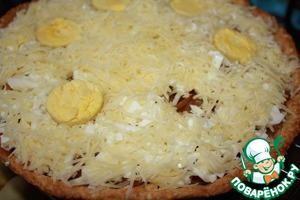 Заливаем заправкой, присыпаем тертым сыром и - в разогретую до 180*С духовку на 20 минут.