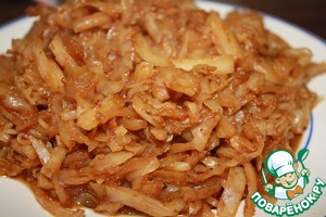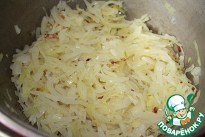 • Пока варится капуста, в кастрюле с толстым дном поджариваем лук до золотистого цвета.