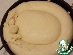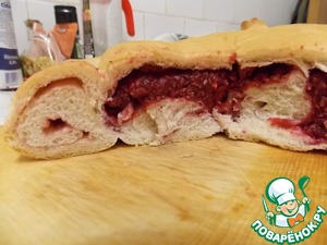 Теперь раскатываем оставшееся тесто и кладем малиновую начинку. Собрать наверху и хорошенько защипать.