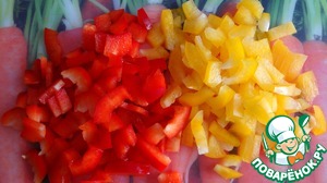 • Добавляем нарезанный болгарский перец (я использовала по 1/4 красного и желтого - для придания блюду яркости) и грибы (у меня замороженные и нарезанные).