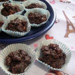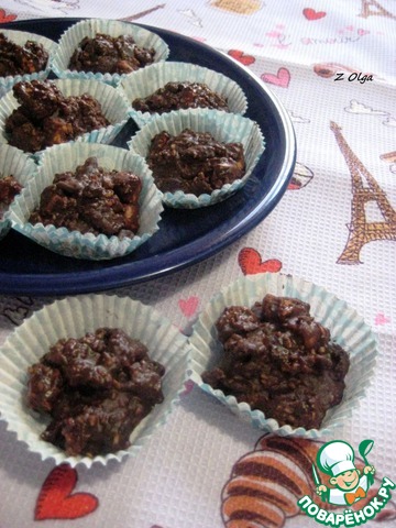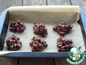 Перемешайте как следует, чтобы все ингридиенты покрылись шоколадом. И с помощью двух ложек выложите конфеты на противень, застеленный бумагой для выпечки. У меня получилось 15 штучек.