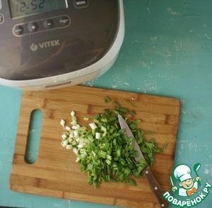 Зеленый лук измельчить, обжарить на сливочном масле до мягкости на режиме поджаривание.