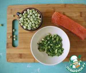 Горошек разморозить на воздухе. Форель нарезать на кубики.