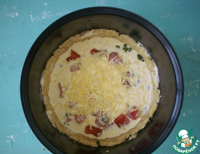 Залить сметанно-яйчной смесью, присыпать сыром. Поставить на режим выпечка на 50 минут.