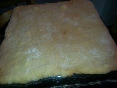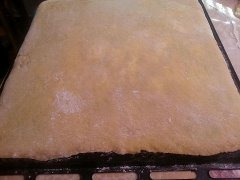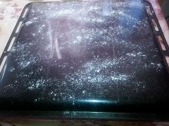 Противень поворачиваем на изнанку, обсыпаем мукой, печем коржи