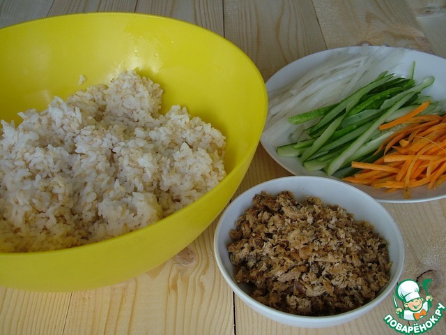1. Что касается риса, то как я уже отметила, в последнее время в Корее набирает популярность коричневый рис для приготовления роллов. Клейкий рис используется очень редко. Я взяла пополам круглозернового белого риса и коричневого цельнозернового. Промыла до прозрачной воды. Залила рис 400 г холодной воды, довела до кипения на сильном огне, затем на самом минимальном огне варила под крышкой 10 минут. Пока рис варится, мы его не трогаем и не перемешиваем. Так он получается приготовленным как-бы на пару. Сняла рис с огня и оставила еще на 10 минут под крышкой. В готовый рис можно добавить ложку кунжутного масла, семечки кунжута, можно немного подсолить. Обильно приправлять рис уксусом в Корее также не принято.