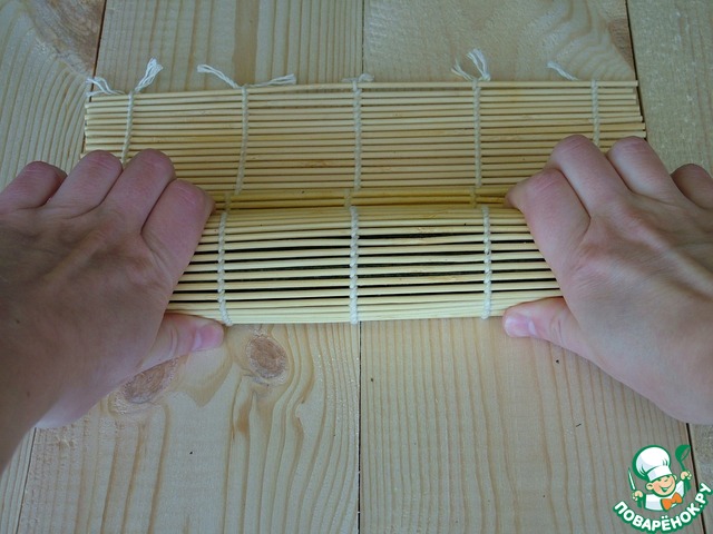 Сворачиваем все с помощью бамбукового коврика в плотную колбаску, начиная с заполненной стороны. Свободную сторону смачиваем водой и приклеиваем к колбаске. Получившийся ролл разрезаем на куски толщиной около 2 см, смачивая нож холодной водой. Повторяем с оставшимися листами нори и начинкой.