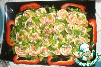 4. Формируем роллы также, как и японские - с помощью бамбуковой циновки. На бамбуковый коврик кладем лист нори (ким) и равномерно распределяем рис слоем 0,5 - 1 см (оставляем свободное место для сворачивания). Поверх риса полосками распределяем начинку.
