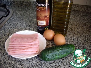 Вот все, что нам понадобится: два яйца, огурец, ветчина, масло оливковое, бальзамический уксус и немного соли. Ветчину я купила в упаковке, нарезанную ломтиками.