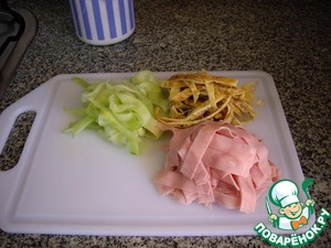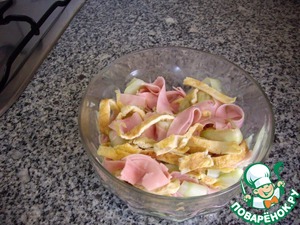 Пока яйца остывают, нарежем огурец с помощью овощечистки или ножа длинными полосками, так же нарежем ветчину. Огурец посолить, сок не выливать. Остывшие блинчики так же нарезать полосками. -