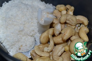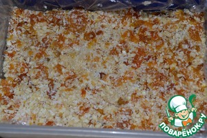 Желатин нагреть на водяной бане до полного растворения, смешать с персиковым пюре и выложить на орехо-кокосовую основу в форму. Убрать в холодильник до полного застывания.