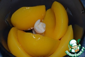 Персики откинуть на дуршлаг (две половинки персиков отложить), измельчить в блендере. Получится персиковое пюре. -