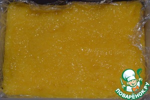 Форму застелить пищевой пленкой. Выложить приготовленную массу, прижимая, разровнять ложкой. Убрать в холодильник