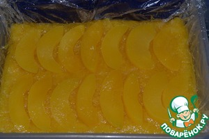Замочить оставшийся желатин 5 г в 2 ст. л. персикового сиропа до набухания. Желатин нагреть на водяной бане до полного растворения и смешать с персиковым сиропом. Залить персиковым желе из сиропа дольки персиков. Убрать в холодильник. -