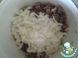 • К мясу добавить замаринованный лук.