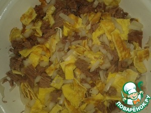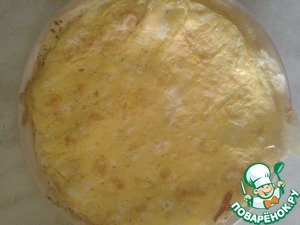 разогреть сковороду, смазанную маслом, и вылить на нее взбитое яйцо. Пожарить вот такой блинок; и так с каждым яйцом.
